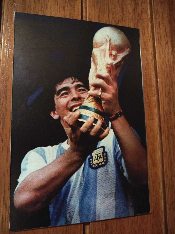 A color photographic print, oriented vertically, depicts Diego Maradona holding the FIFA World Cup trophy