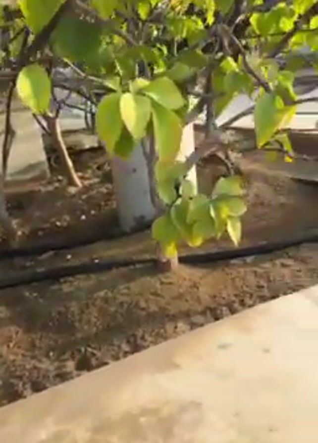 brown and grey bird walking near a swimming pool. The bird is initially under a tree with green leaves. It then walks onto a light-colored concrete area near the pool's edge. The pool water is calm and reflects sunlight. The background includes buildings and other greenery. The video seems to be taken outdoors during daylight.