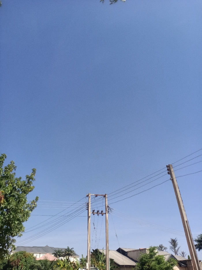 The image depicts a residential street scene in Lekki, Nigeria, under a clear, bright blue sky. The upper two-thirds of the frame consist solely of the unobstructed sky. In the lower third, prominent electrical infrastructure is visible. Towards the center-left, a wooden utility pole structure, composed of two vertical posts, supports multiple horizontal cross-arms with ceramic insulators. Numerous black electrical wires are strung between these insulators, forming a dense network extending horizontally across the mid-ground. To the right, a single, lighter-colored concrete utility pole stands, leaning noticeably towards the right side of the frame. This pole also supports several parallel electrical wires. Green, leafy vegetation from trees is prominent on the left side, with some foliage extending into the upper left corner. More greenery and various tropical plants are visible along the bottom edge, partially obscuring several residential buildings in the background. These buildings feature dark and light-colored roofs, characteristic of housing structures, with some palm trees also visible among them. No individuals, discernible actions, or direct interactions are visible within the frame. The scene is illuminated by natural daylight.