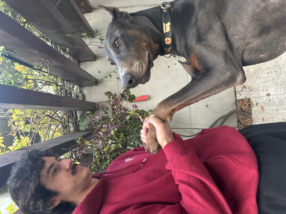 A man lies down wearing a maroon hoodie. A large gray dog with brown markings and a decorative collar stands above him, paw in hand. Vines climb a wooden pergola behind them, adjacent to a concrete wall. Leaves and debris are scattered on the ground in the background.