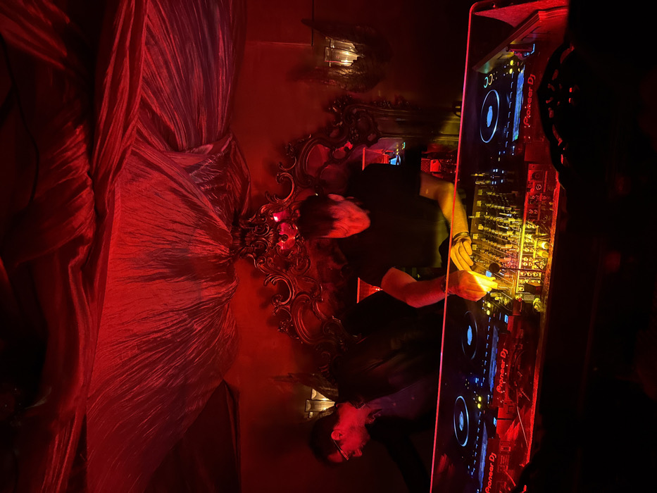 A red-lit interior scene depicts two males operating professional DJ equipment within an upscale entertainment venue in New York City, United States. In the foreground, a male in a dark short-sleeved shirt actively manipulates a Pioneer DJ mixer, distinguished by its glowing orange and blue controls. His left hand is positioned on a fader. The DJ console, comprising two Pioneer DJ decks and the central mixer, is positioned behind a transparent barrier. To the left and slightly behind, a second male, wearing glasses and a dark long-sleeved shirt, observes. The background features a large, ornate, gilded headboard-style fixture centered on the wall behind the performers. Crimson draped fabric adorns the ceiling, and two warm-lit wall sconces flank the central ornate piece. Two stemmed glasses, appearing to contain red liquid, are visible on a surface behind the DJ equipment.