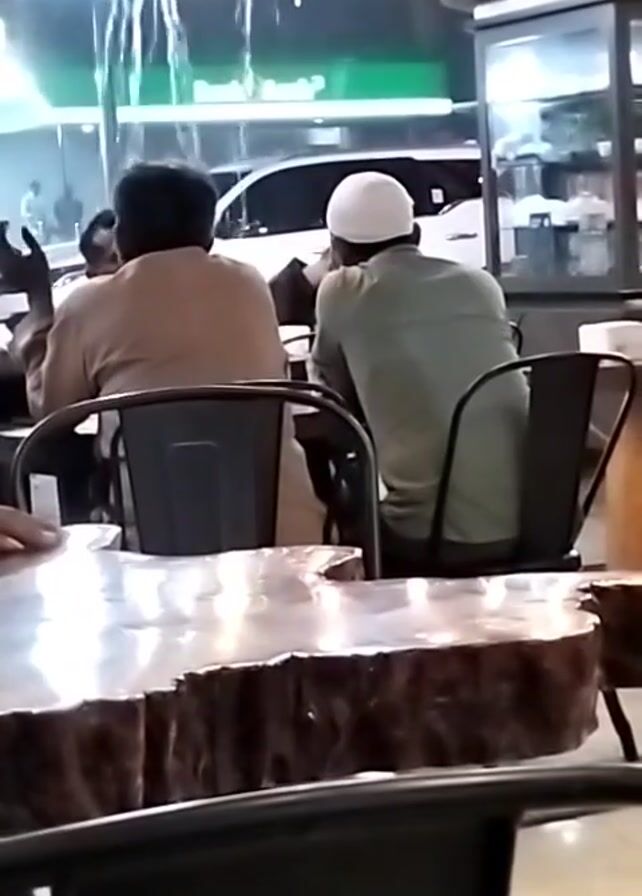 Three men are seated at tables in an indoor or semi-outdoor setting, facing away from the camera. Two of the men are at one table; one man wears a tan shirt and the other a green shirt and a white skullcap. The third man is at a different table partially obscured by a large, shiny, oddly-shaped table in the foreground. The tables are set on what appears to be a patio or porch with a decorative water feature in the background, blurring due to the out-of-focus depth of field. Through the window, the lights and shapes of passing cars are seen on a street.