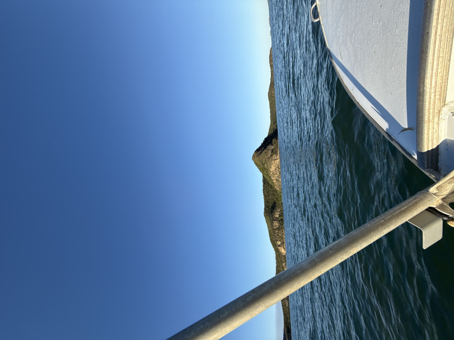 The image depicts a daytime maritime scene from a small vessel on the water, with a clear blue sky overhead