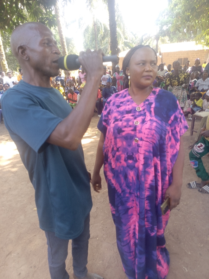A man holds a microphone and speaks, while standing next to a woman in a bright pink and blue patterned dress. They are outdoors, standing on dirt, with a crowd of people seated in the background. Some trees are visible overhead. The woman holds a phone in her hand. The man is wearing a t-shirt and jeans.