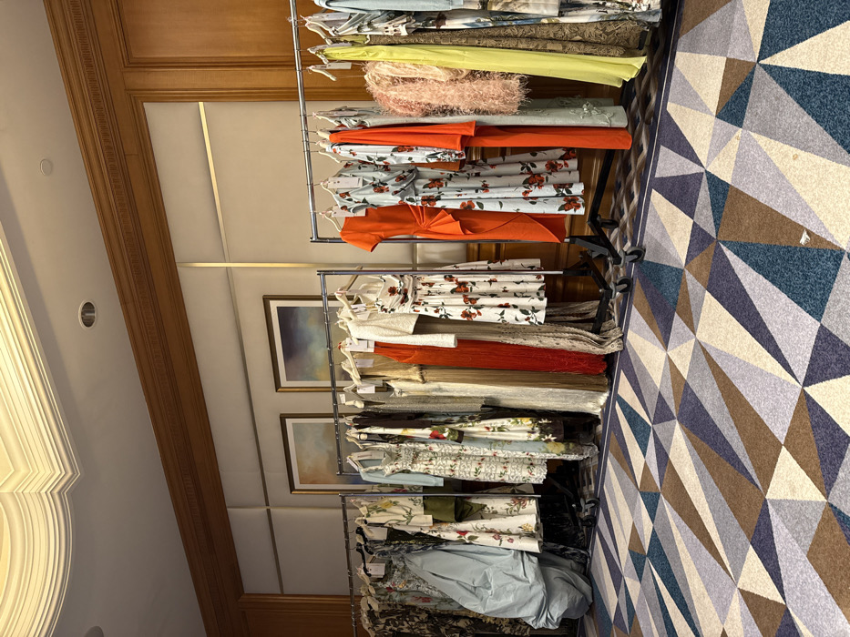 Clothing racks display garments with varying colors and floral patterns