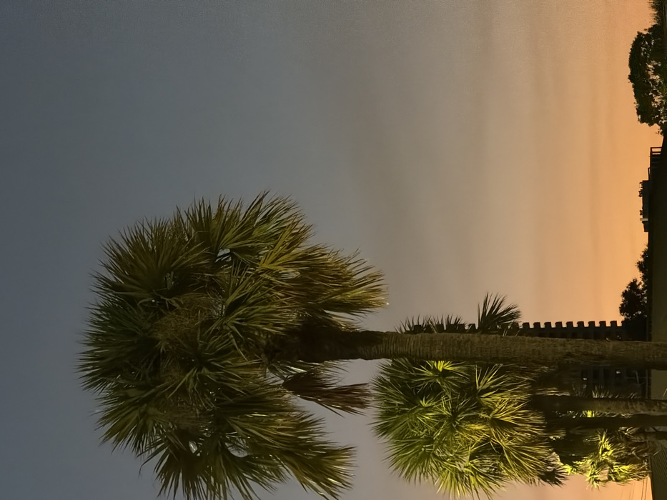 The image depicts an outdoor scene at twilight in Houston, Texas, United States of America. The sky presents a gradient, transitioning from a dark grey-blue at the top to a bright orange and yellow along the horizon, indicating either sunset or sunrise. The primary subjects are several palm trees, with one tall, mature palm prominently centered in the left half of the frame. This tree has a robust trunk and dense, fan-shaped fronds that appear brightly illuminated with a yellowish-green light, suggesting artificial lighting from an unseen source. Behind and to the left of the main palm, a smaller, similarly lit palm tree is visible, with additional palm trees receding further into the background on the left. In the mid-ground, silhouetted against the vibrant orange sky, are the dark outlines of urban infrastructure and vegetation. A tall, multi-story building with a visible stepped or tiered architectural design is discernible behind the central palm tree. Further along the horizon, indistinct dark masses represent other buildings and tree canopies. No people, specific actions, or interactions are visible within the frame. The environment is consistent with an urban or suburban setting in Houston.