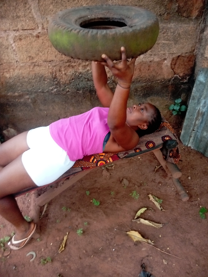 - "A woman in a pink tank top and white shorts lies on a bench covered with patterned fabric, lifting a large tire overhead" by FM-m0BBE2, licensed under CC BY 4.0