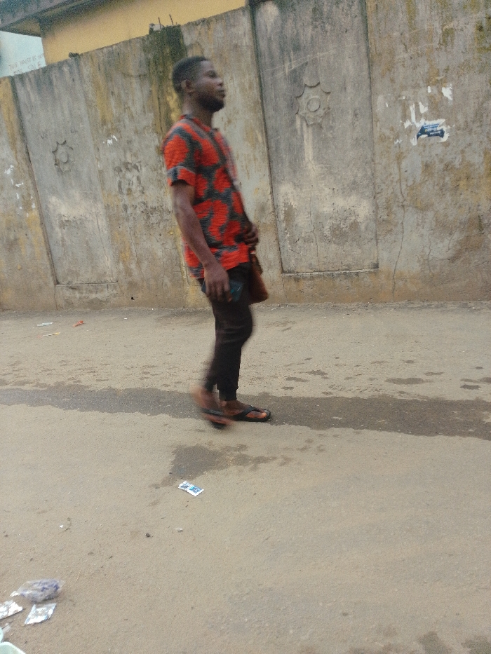 A person walks on a gray street, with a large gray wall behind them. The individual wears a patterned red and black shirt, dark pants, and brown sandals. The wall is old and weathered, with some decorative indentations and peeling patches. The street has bits of scattered debris and stains. The person is out of focus due to motion.