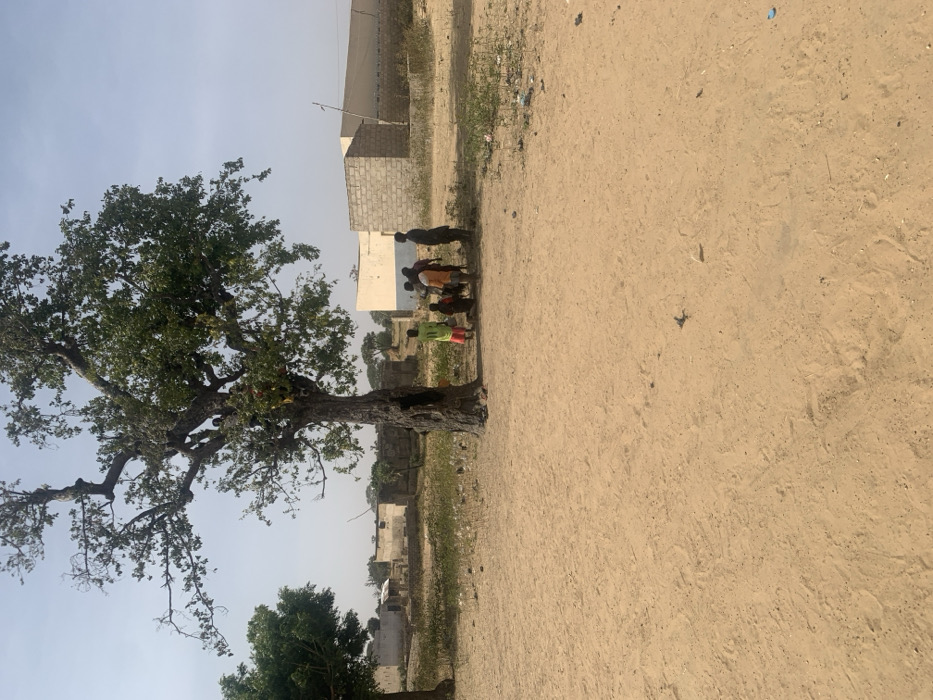 This image depicts an open, sandy area in Dabawa, Nigeria, under a clear, light blue sky