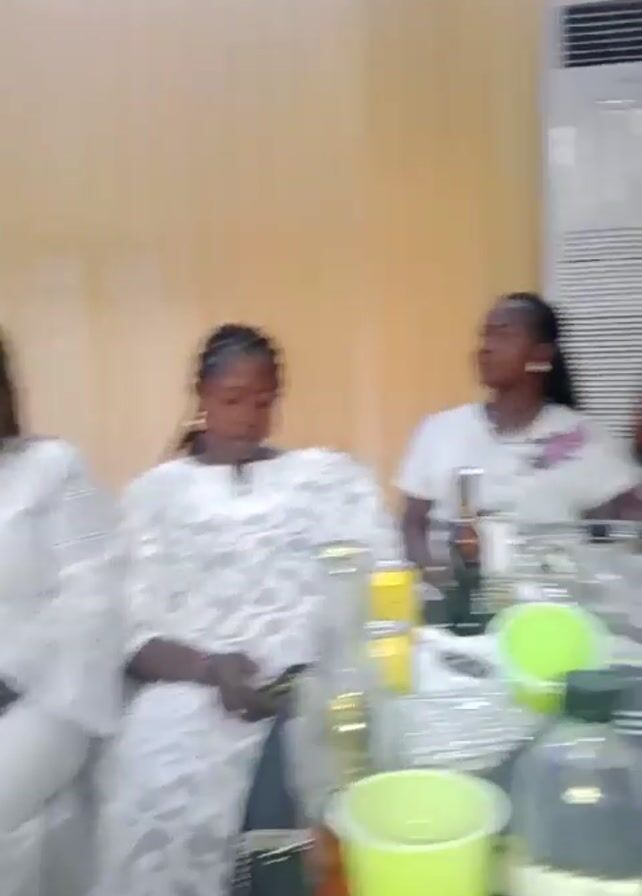 group of people sitting at a long table, likely at a celebration or event. The individuals, mostly women, are dressed in white. The table is covered with a black cloth and is laden with drinks, including beer, liquor, and water, as well as green plastic cups, limes on a green plate, and other items. A tall, ornate floral arrangement sits in the middle of the table. The room is well-lit with natural light coming from windows, and there is a tan-colored curtain in the background. There is also a tall air conditioning unit visible. The people seem to be socializing and enjoying themselves.
