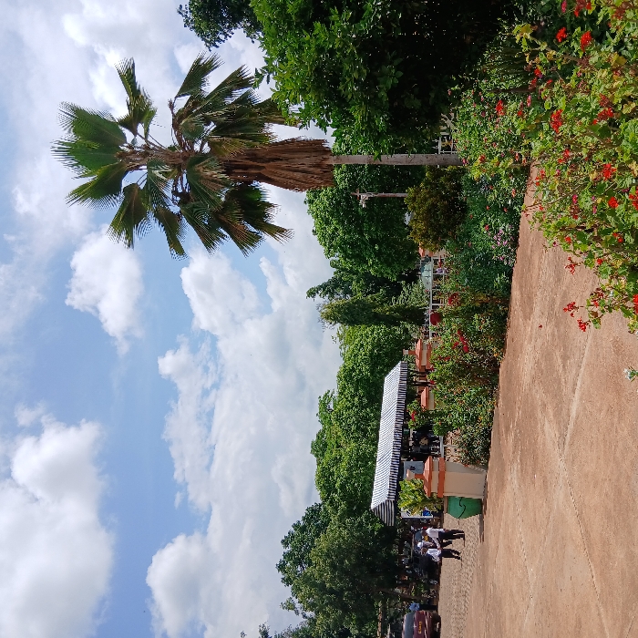 This image depicts an outdoor landscaped area in the city of Moshi, Tanzania, under a partly cloudy blue sky