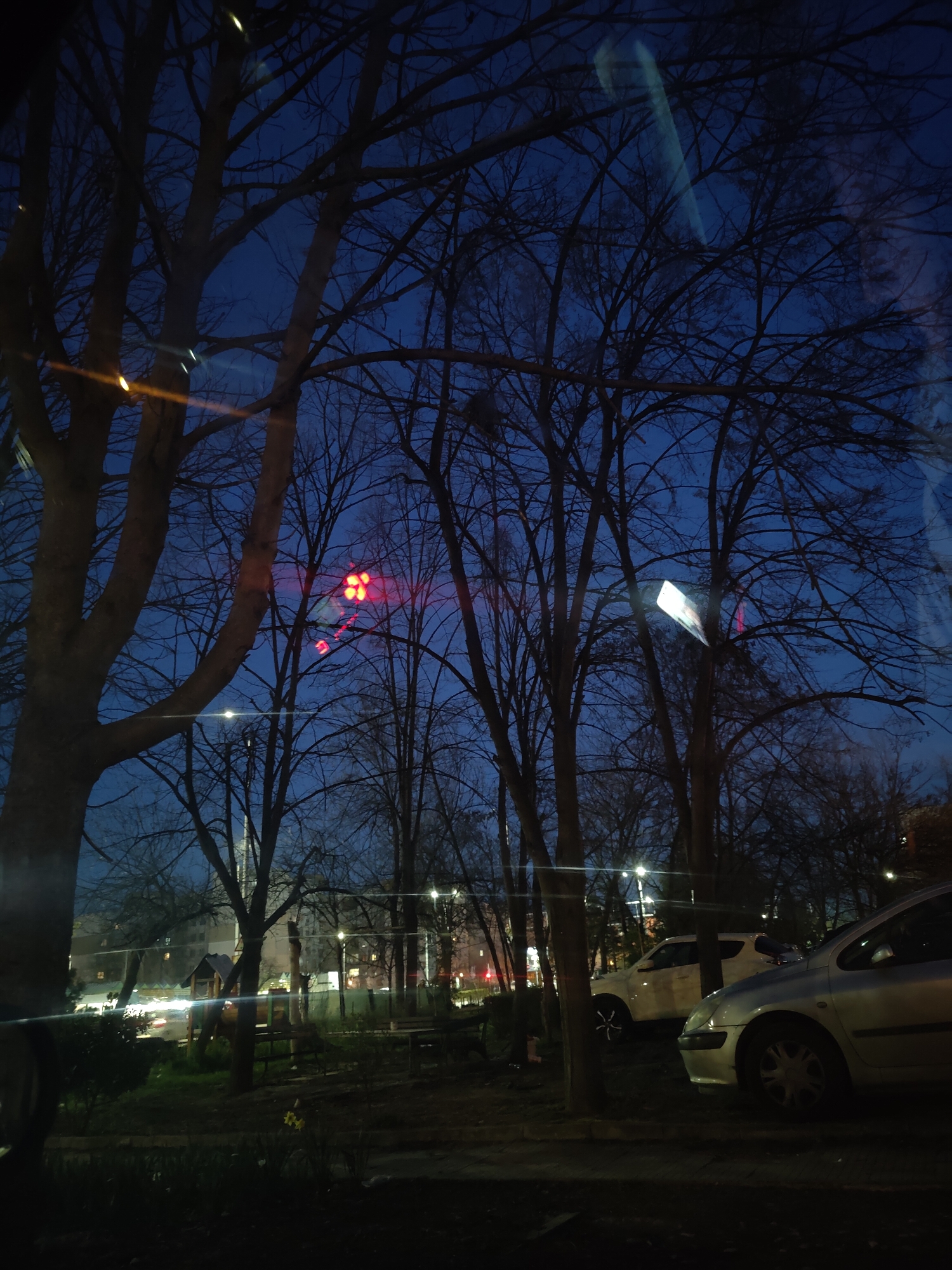 The image presents an urban exterior scene at dusk or night, viewed through a reflective glass surface, likely within the city of Plovdiv, Bulgaria. The foreground is occupied by the dark silhouettes of numerous deciduous trees, their bare branches extending across the frame against a dark blue twilight sky. In the mid-ground, a park or green space is visible, dimly lit by distant artificial sources. Features include patches of green ground cover, a few yellow daffodils, and the partial outline of a wooden playground structure. Benches are vaguely discernible. A roadway traverses the scene horizontally, marked by blurred streaks of white and red vehicle lights, indicative of ongoing traffic. Streetlights with white illumination are present throughout the mid-ground and background. Multiple red circular lights, consistent with traffic signals, are visible through the tree canopy towards the left-center. On the right side, two parked vehicles are in clear view: a silver hatchback (resembling a Peugeot 307) positioned closest to the observer, and a white sport utility vehicle parked further back. The background features multi-story residential buildings with various illuminated windows. No individuals are clearly identifiable within the scene.