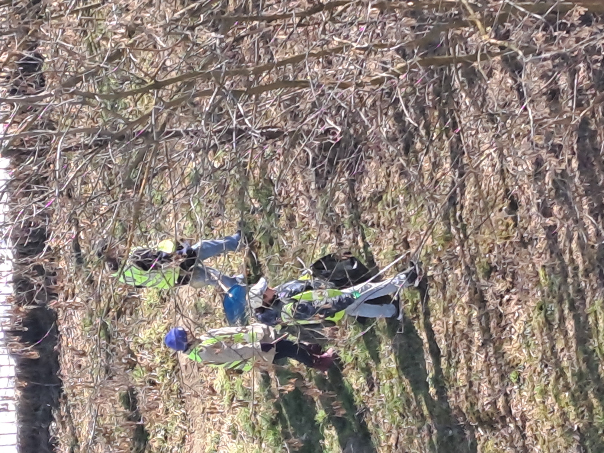 The image depicts three individuals on a sloped, vegetated embankment, presumably in Yegoryevsk, Russia, though the specific location within the city is not discernible. The scene is illuminated by natural sunlight, casting shadows. Three adults are visible. All three wear high-visibility yellow or lime green vests over their clothing, suggesting a work or volunteer activity. * The individual on the left wears a blue knit cap, a light-colored jacket, dark pants, and dark reddish-brown boots, and is positioned facing generally right, looking downwards. * The individual in the center-background wears a high-visibility vest, blue jeans, and light-colored shoes, and appears to be handling a blue object, possibly a bag or tarp. * The individual in the right-foreground wears a light-colored cap, a dark jacket, light-colored pants, and dark shoes. This person is holding a long, pole-like tool, consistent with a litter picker or rake, and has a dark bag, possibly for waste collection, nearby. The ground is covered with a mixture of sparse green grass, dry brown leaves, and numerous fallen twigs and bare branches. To the right and extending through the middle of the frame, a dense growth of leafless deciduous branches and small trees is present, obscuring parts of the background. The terrain appears uneven and slopes upwards from the right foreground towards the upper left. The overall activity suggests a cleanup or maintenance operation.