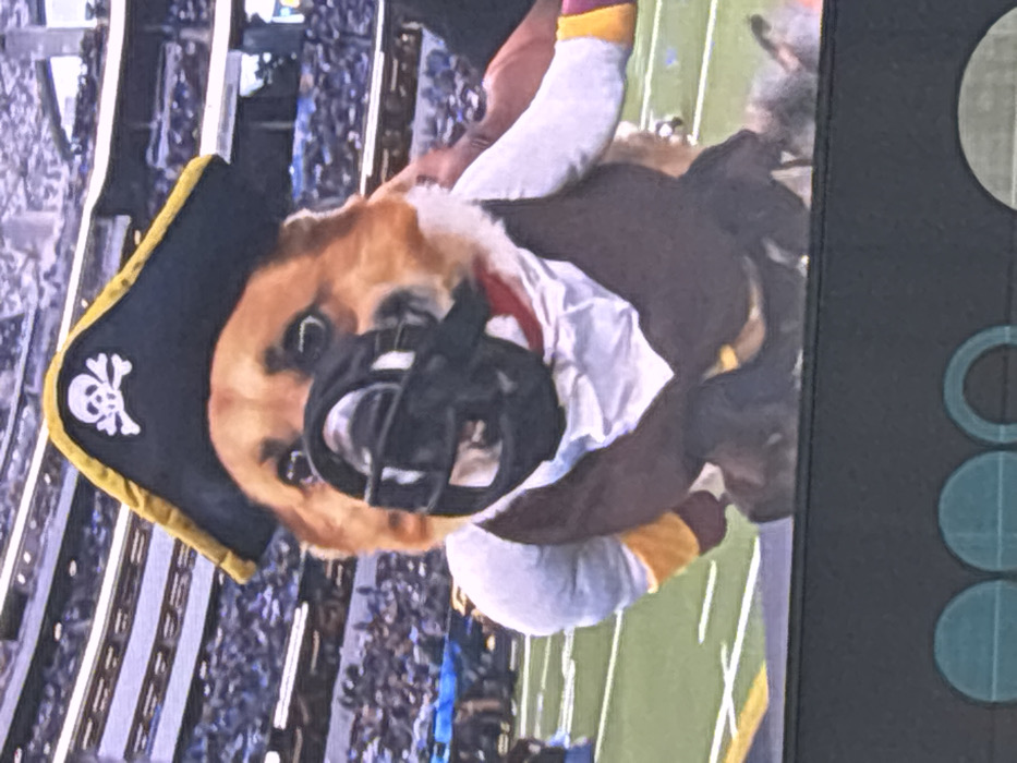 A medium shot depicts a dog dressed as a pirate wearing a football helmet. The dog has brown fur and is wearing a black pirate hat with a white skull and crossbones emblem. It also has a black football helmet on its head. The dog appears to be sitting or lying down. In the background, there are stadium seats and the edge of a football field. The image is slightly blurry, as if captured from a television screen.