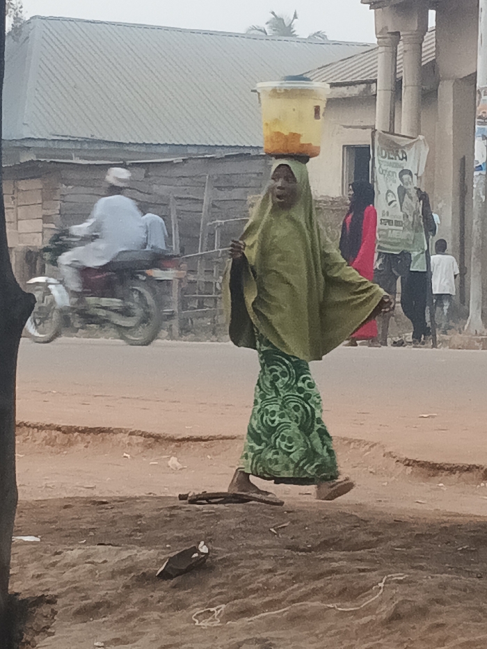 A woman balances a translucent container atop her head, walking on a dirt shoulder adjacent to a street. She wears a green hijab and a patterned green skirt. A motorcycle with two people is blurred in the background. Behind her are other pedestrians, a building with columns, and a political poster. The scene is captured in muted daylight, lending a slightly hazy atmosphere.