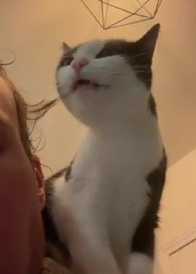 A low-angle close-up shows a person with curly hair and a black and white cat