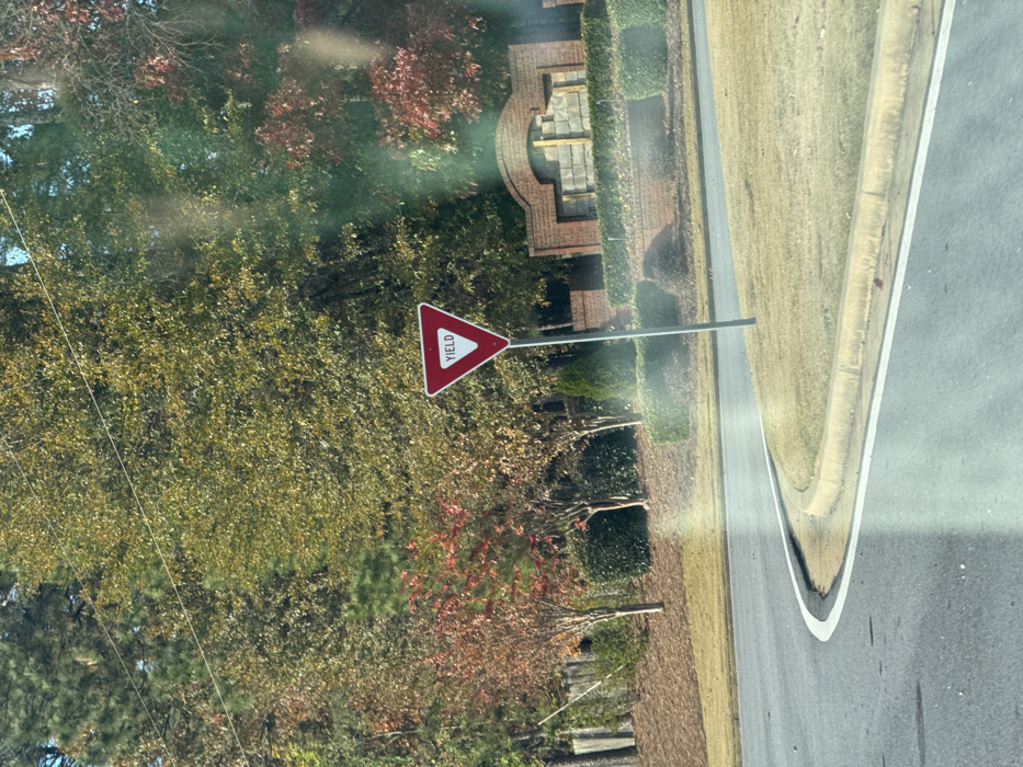 A yield sign stands beside a road bordered by manicured grass and shrubs, with a brick structure in the background. The sign is red and white with the word "YIELD" printed in bold letters. The scene is captured from a slightly elevated perspective, possibly from inside a vehicle, showing a section of the road stretching into the distance. The surrounding landscape includes trees with autumn foliage.