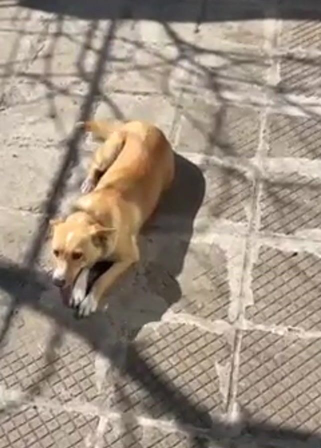A video shows two dogs in an outdoor setting with grey tiled flooring