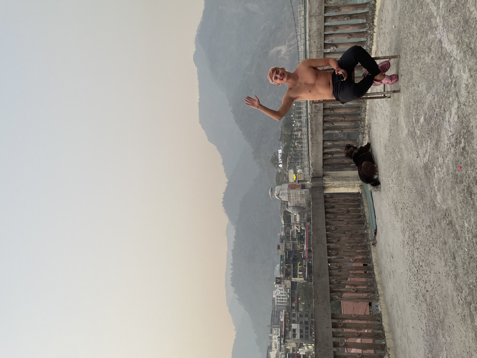 This image captures a rooftop scene in Rishikesh, India, with the Lakshman Jhula bridge and surrounding cityscape in the background