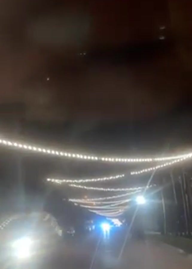 night scene, likely from inside a moving vehicle. The road is decorated with strings of evenly spaced, warm white lights overhead. Car headlights appear in the distance, and a few parked cars are visible on the side of the road. Trees line the sides of the road, and streetlights provide additional illumination. The overall impression is of a festive or decorated area at night.