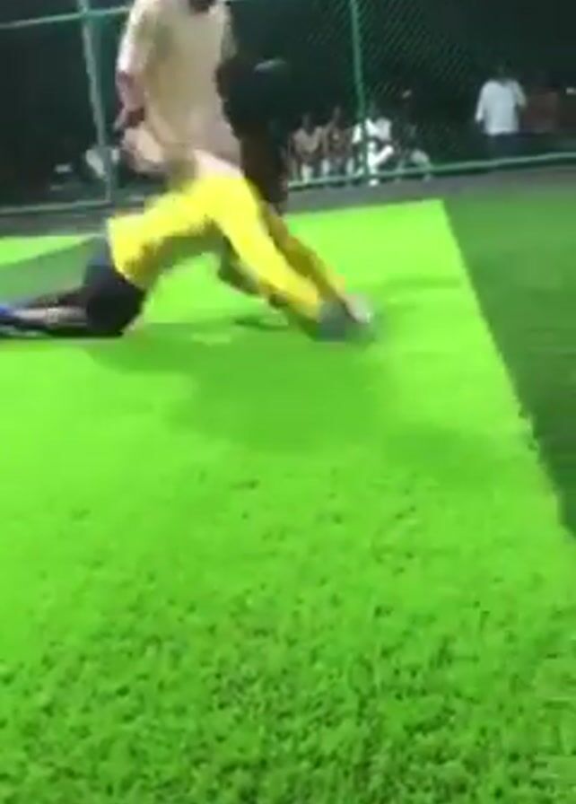 On a bright green artificial turf field, two dark-skinned men are engaged in a physical altercation. One man, wearing a yellow shirt and dark shorts, is on the ground while the other, dressed in white, appears to be either jumping over him or falling onto him. A crowd of spectators is visible behind a green wire fence in the background, watching the event unfold. The scene is well-lit, suggesting it is taking place either during the day or under artificial lights.