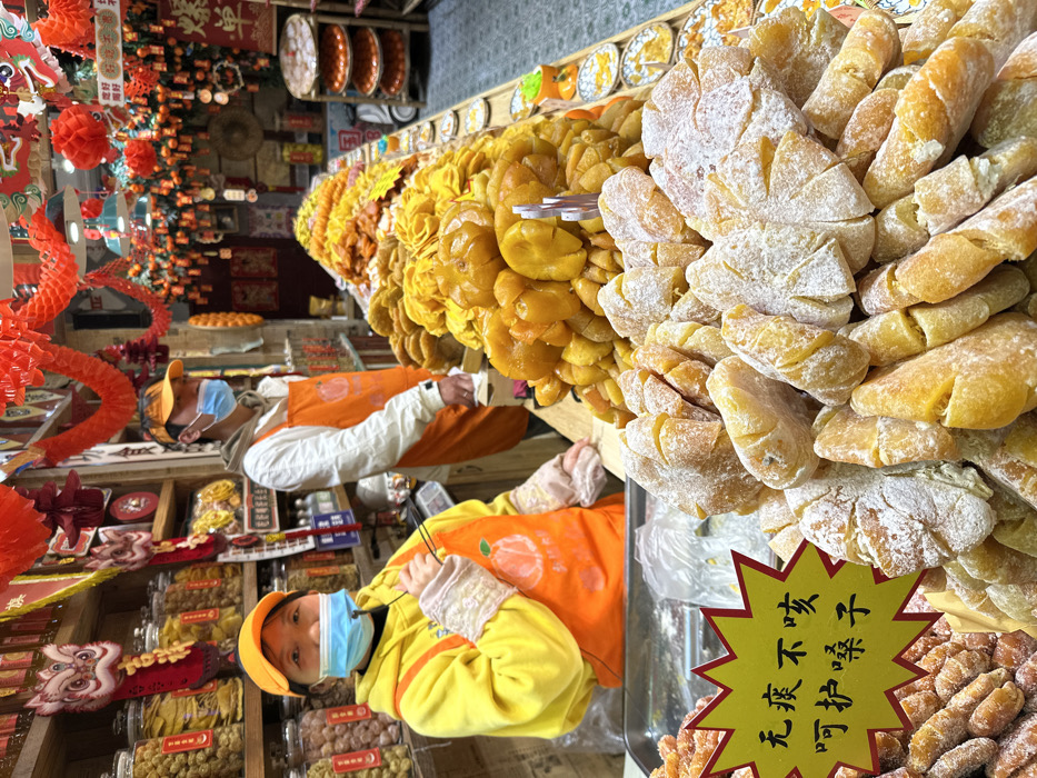 A vibrant display of candied fruits and festive decorations fills a store. Two individuals wearing masks and orange vests stand behind a counter laden with jars of dried goods. Rows of candied fruits, dusted with white powder, line the top of the frame, contrasting with the red lanterns and paper dragons hanging above the shelves. A yellow sign with Chinese characters is visible among the treats.