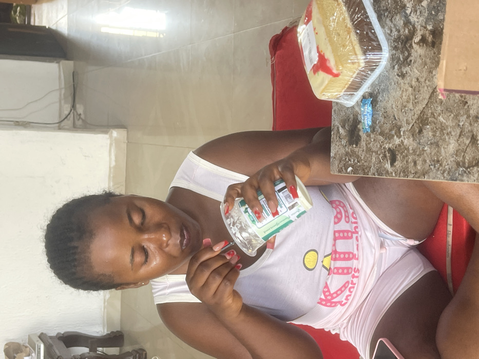 An indoor scene depicts a dark-skinned female seated on a red mat or cushion, likely within a residential setting in the city of Alor, Nigeria. Her hair is styled in tight braids, and her fingernails have red tips. She wears a white sleeveless top with the text "Kitty Sports Fashion" and light pink shorts. She is actively eating from a clear plastic cup with a green label, using a small spoon, with her eyes cast downwards. To her right, on a dark, mottled-patterned table, rests a rectangular two-layered cake (light-colored top, darker bottom) with red icing, encased in clear plastic wrap. Adjacent to the cake is a blue and white candy wrapper. A pink-cased mobile phone is visible on the red surface to her left. The background features light-colored tiled flooring, white walls, a dark wooden furniture piece, and a partially visible doorway.