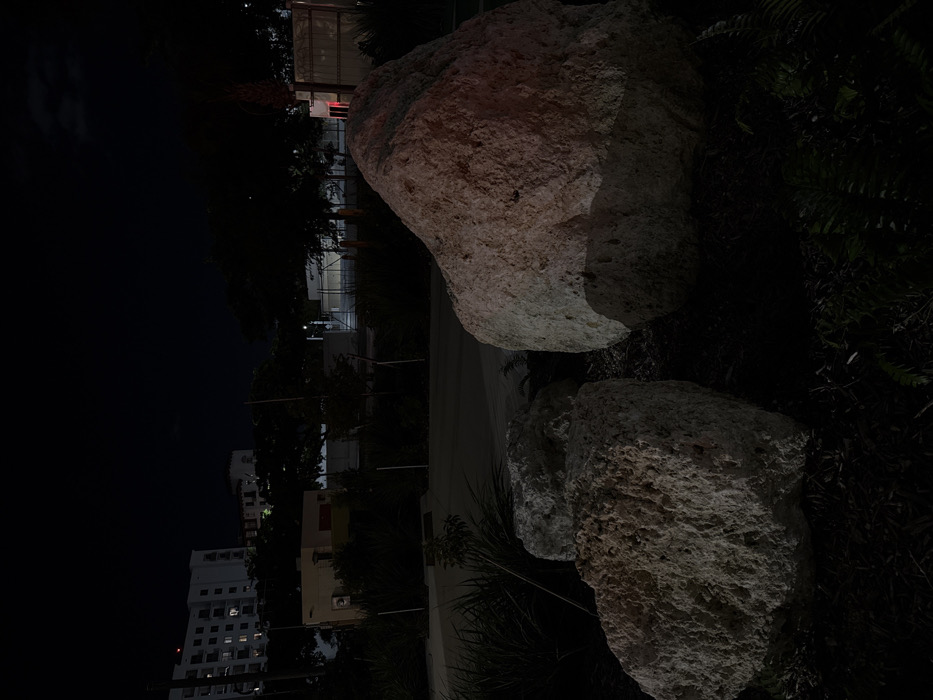 Two large, porous rocks dominate the foreground, with dark foliage to their right. Beyond a narrow sidewalk, city buildings rise against the night sky. The buildings, illuminated by scattered lights, transition to darker trees further away. A tall fence and some lights provide definition for a space between trees on one side. The overall scene is dimly lit.