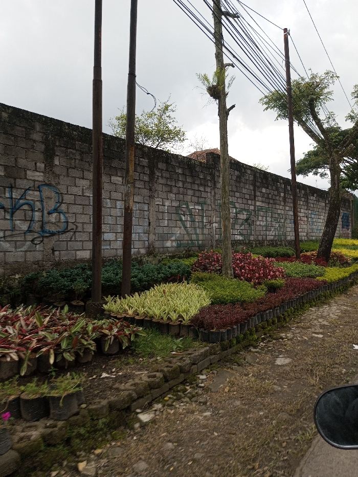 The image depicts an outdoor scene in Sukanagalih, Indonesia. A long, grey cinder block wall, marked with blue and lighter graffiti, stretches horizontally across the mid-ground. Above the wall, an overcast, light grey sky is visible. In front of the wall, a cultivated garden bed runs parallel, featuring a variety of ground cover plants and potted flora. Three prominent vertical structures, identified as utility poles, are positioned in front of the wall. Two on the left are rusty metal, while a central pole appears to be a stripped tree trunk or wooden pole, from which multiple black electrical wires extend diagonally towards the upper right. A thinner, brown pole is visible further to the right. Behind the wall, sparse green tree foliage is visible against the sky. The garden bed in the foreground is bordered by a low retaining wall constructed from stacked concrete blocks. Within the bed, various plants are arranged: on the far left, reddish-green variegated plants are contained in black pots. Adjacent to these are rows of light green and yellowish variegated plants, also in black pots. Further to the right, patches of dark green, red, and yellow-green ground cover plants are neatly laid out, with some contained in individual black plastic sleeves forming a border along the retaining wall. The ground immediately in front of the retaining wall consists of dirt, gravel, and sparse dry grass. A small, dark-colored vehicle side-view mirror is partially visible in the bottom-right corner of the frame. No individuals are visible.