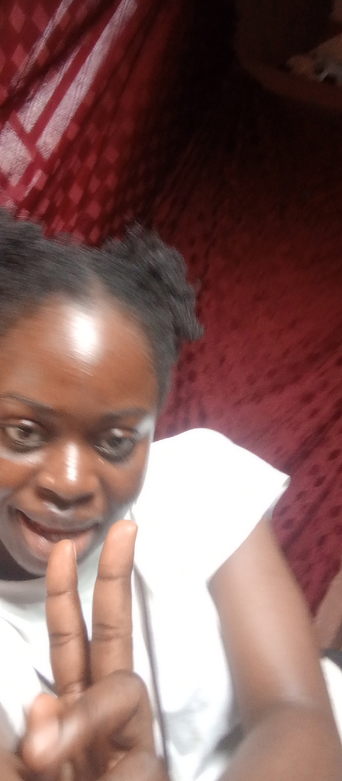 A close-up, portrait-oriented image shows one individual, an adult female with dark skin and dark, textured hair styled with small buns or twists on top. She is wearing a white garment. Her face is illuminated, displaying a highlight on her forehead, and she has a slight smile with her eyes directed towards the camera. Her right hand is raised, with the index and middle fingers extended upward in a "V" gesture. The background consists of a deep red fabric, possibly a curtain or upholstered surface, exhibiting a subtle, repeating grid or diamond-like pattern in areas with more light reflection. The scene is indoors. The specific location in the city of Unknown, Unknown cannot be determined from the image.