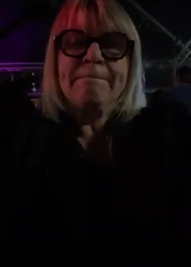 In a dimly lit indoor setting, a woman with fair hair and glasses looks at the camera. She is wearing black clothing. Loud music plays in the background. There are people in the background, and stage rigging is visible above.