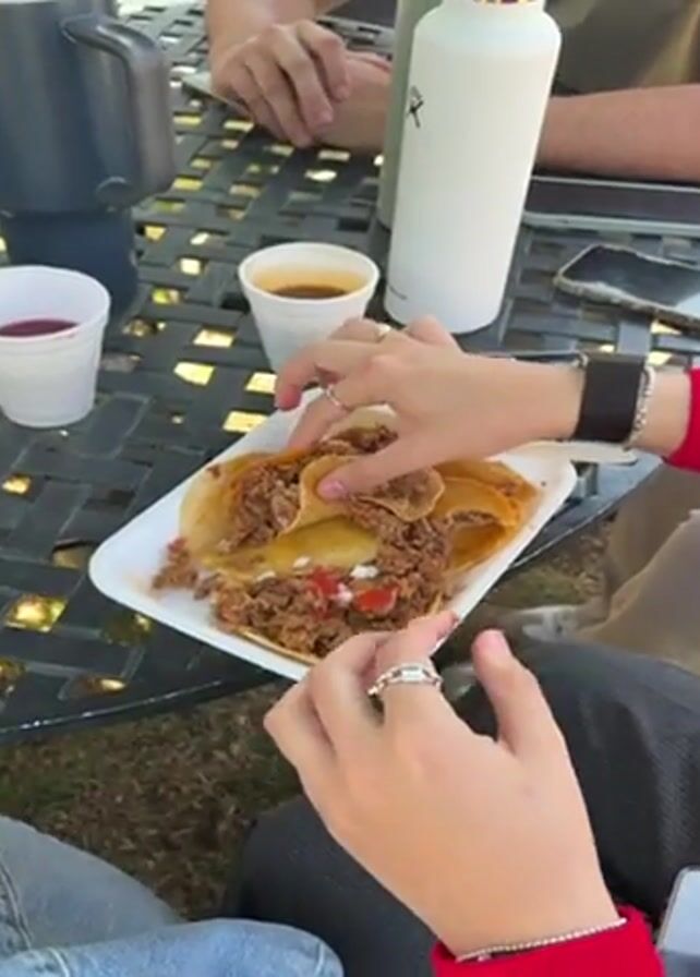 group of people sitting around a black outdoor table, eating tacos. A person in a red jacket is filling a taco with ground beef from a white styrofoam plate. There are other people seated around the table. There are two cups with liquid and a white water bottle on the table. There are cell phones on the table. The table is on a grassy surface.