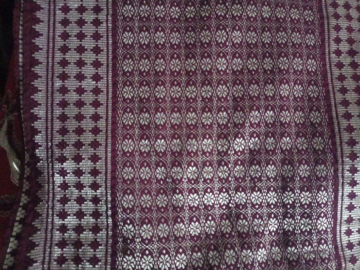 A close-up image taken in Bamhori, India, depicts a piece of woven textile. The fabric is predominantly maroon with intricate silver-colored patterns. The central area of the fabric features a repeating pattern of stylized floral or snowflake-like motifs, each contained within an oval, arranged in a dense, offset grid. A vertical border is visible on the left side, comprising a wider strip with repeating diamond shapes in silver, and an adjacent narrower strip along the very edge displaying a zig-zag pattern in silver. The textile appears to be smoothly laid out, with no people, objects, or environmental elements other than the fabric itself visible in the frame.