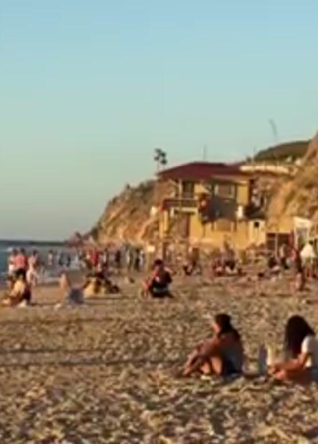 The scene is a beach filled with people on a sunny day. Many individuals are sitting or lying on the sand, while others are walking along the shoreline. Some people are standing near a wooden fence. A building with a red roof sits on a small plateau above the beach. The beach is bordered by a tall, sandy cliff. The ocean is visible in the background.