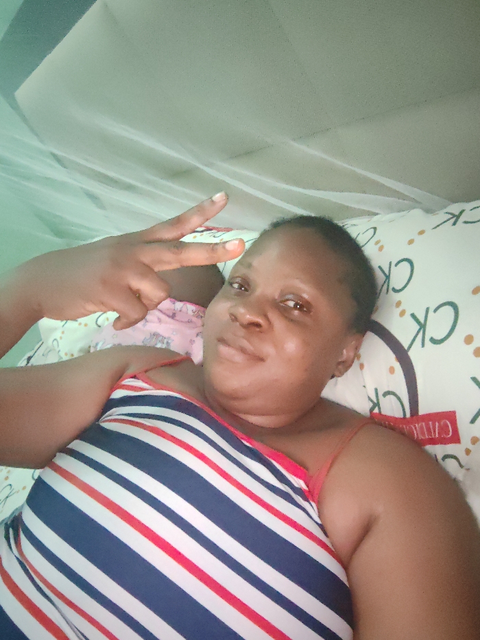 The image displays an adult woman and a partially visible infant or child lying indoors. The woman, with a light complexion and short dark hair, is positioned on her back, facing the camera with a slight smile. She wears a sleeveless top featuring diagonal stripes in navy blue, white, and red. Her left hand is raised to head level, forming a peace sign with the index and middle fingers extended. A small portion of an infant or child, dressed in pink, is visible behind the woman's raised hand. The woman's head rests on a pillow with a light background patterned with repeating "CK" logos in dark green or blue; a red tag with inverted white text is partially visible on the pillow. A translucent white mosquito net is draped overhead, occupying the upper portion of the frame, indicating an indoor setting in a tropical region. The specific location within Lagos, Nigeria, cannot be determined from the visual information provided.