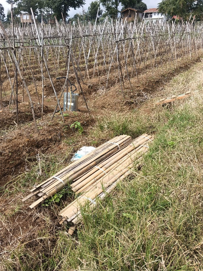 The image depicts an agricultural field in Nam Sa Lat, Myanmar, under natural daylight conditions. The foreground consists of dry and green grass, with a visible patch of disturbed brown soil to the left. Resting on the grass in the lower left are two bundles of light-colored wooden or bamboo poles, each secured with white strapping. A partially obscured blue plastic bag is visible near these bundles. The mid-ground is dominated by a field prepared for cultivation, characterized by numerous vertical wooden or bamboo stakes arranged in rows, supporting horizontal cross-members, forming trellises. These stakes are set into brown, tilled earth with sparse, dried vegetation. Positioned centrally within these stakes is a silver-colored cylindrical object, likely a sprayer or pump, featuring a yellow handle and a black hose extending from its top. A small patch of green foliage is visible near the base of this object. In the background, beyond the cultivated field, a line of mature trees is visible. Several structures are also present: a wooden building with an elevated foundation is visible through the trees on the left, and a larger, white building with a red roof is partially visible through the trees on the right. No individuals are present in the scene.