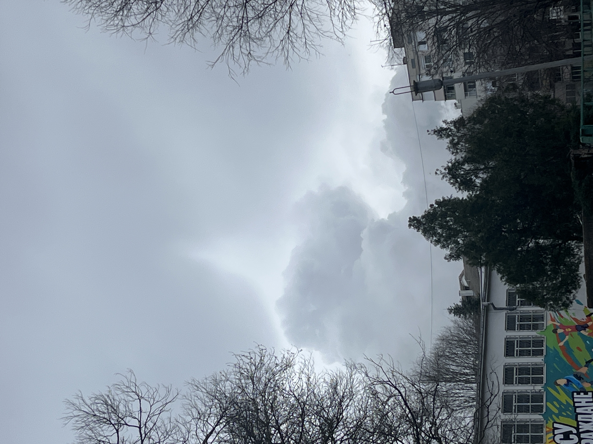 The image captures an overcast daytime scene in Ruse, Bulgaria, specifically at or near the Secondary School "Yordan Yovkov" (formerly known as "SU Rozhdane"), located at ul. "Boris Stefanov" 1. The upper two-thirds of the frame are dominated by a dense, uniform grey sky, heavily clouded, with a prominent, vertically elongated cloud formation rising distinctly in the upper-center, suggesting a localized plume or unique atmospheric condition. In the mid-ground, a low-rise, light-colored building, likely a school, extends across the left half of the frame. It features a flat roofline, a visible gutter, and a series of rectangular windows with protective bars. The lower facade of this building is adorned with a vibrant, multi-colored mural displaying abstract forms in green, yellow, orange, and blue. Partial Cyrillic text "СУ РАЖДАНЕ" is visible on the mural, identifying it as a school. Two stylized figures in athletic poses, one in blue and one in red/orange, are depicted running or jumping on the mural. To the right of this building and in the center-right mid-ground, several dark green evergreen trees with dense foliage are prominent. Further right and partially obscured, a multi-story residential building with numerous windows is visible in the background. A tall, slender grey streetlamp or utility pole, featuring a distinctive U-shaped loop at its top, stands angled slightly to the right in the mid-ground, extending from the bottom to near the top of the frame. Bare, leafless deciduous tree branches frame the top left and top right corners of the image, their intricate skeletal structures silhouetted against the grey sky. A green metal fence or railing is visible along the very bottom edge of the frame. No individuals are present or engaged in direct action within the observable scene, beyond the depicted figures on the mural. The overall atmosphere is subdued due to the grey, diffused light.