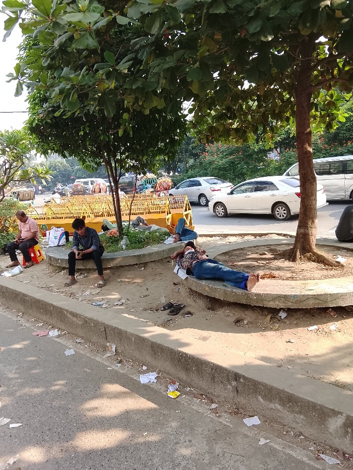 A daytime street scene shows several people resting around tree bases. One man sits on a red stool, looking at his phone. Another man sits on a concrete planter, also using his phone. Two more men are lying down, one on each of the tree's planter. Trash and litter are scattered around the bases of the trees and on the edge of the road. Cars are visible in the background, separated by a yellow barricade. The entire scene is in sunlight.