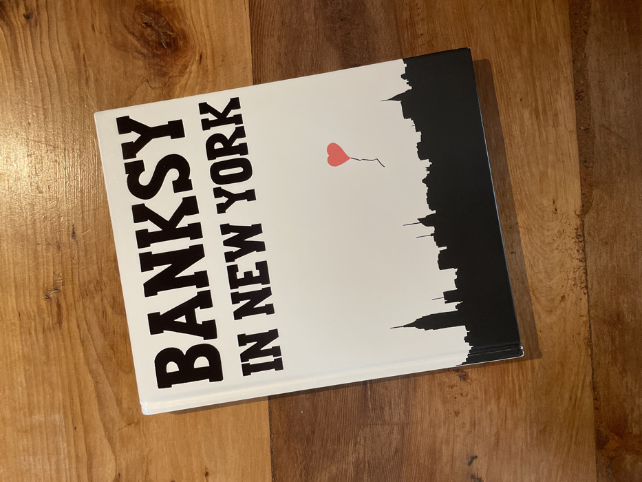 closed book lying flat on a wooden surface. The book is titled "Banksy in New York." The book cover is white with black bold text. The text is set against a white background. The book cover features a silhouette of the New York City skyline, with a red heart-shaped balloon floating above it. The image was taken in Vitacura, Chile, at the coordinates -33.387, -70.584. The book appears to be in good condition. The wooden surface is brown with a grain pattern. There are no people or other objects in the scene.