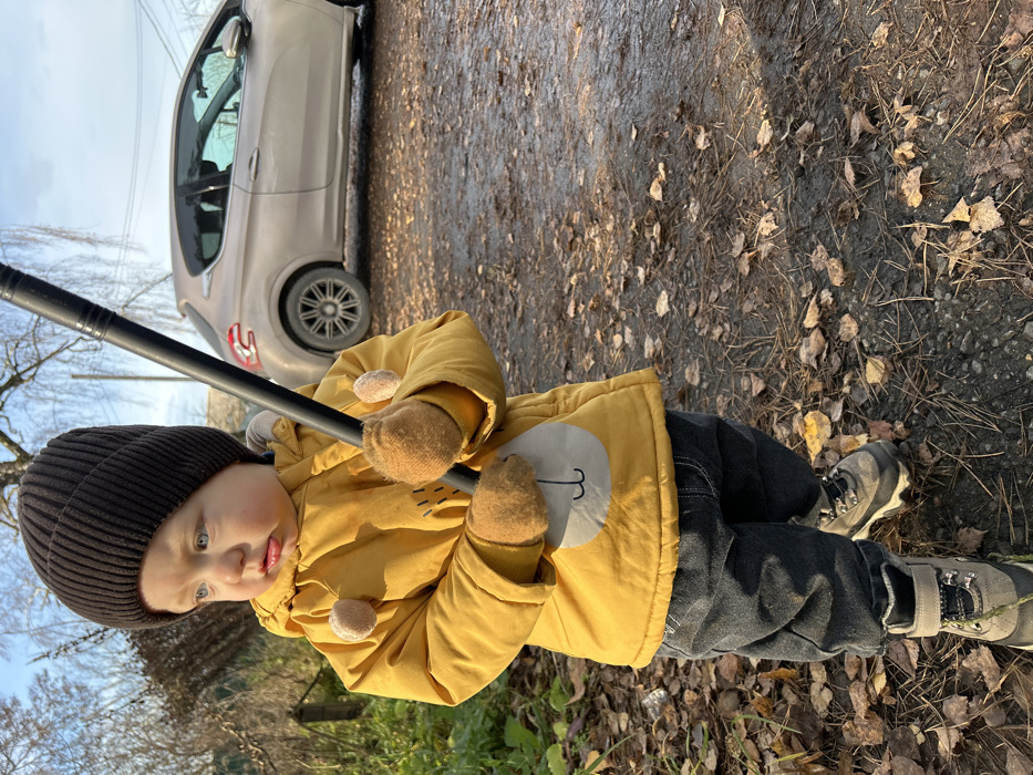 A child in a dark beanie, yellow coat, grey jeans, and hiking boots stands in a grassy area with fallen leaves. The child holds a black pole with both hands. A light brown car is parked on the right side of the frame. The ground appears wet with a mix of grass, leaves, and dirt. The sky is cloudy in the background.