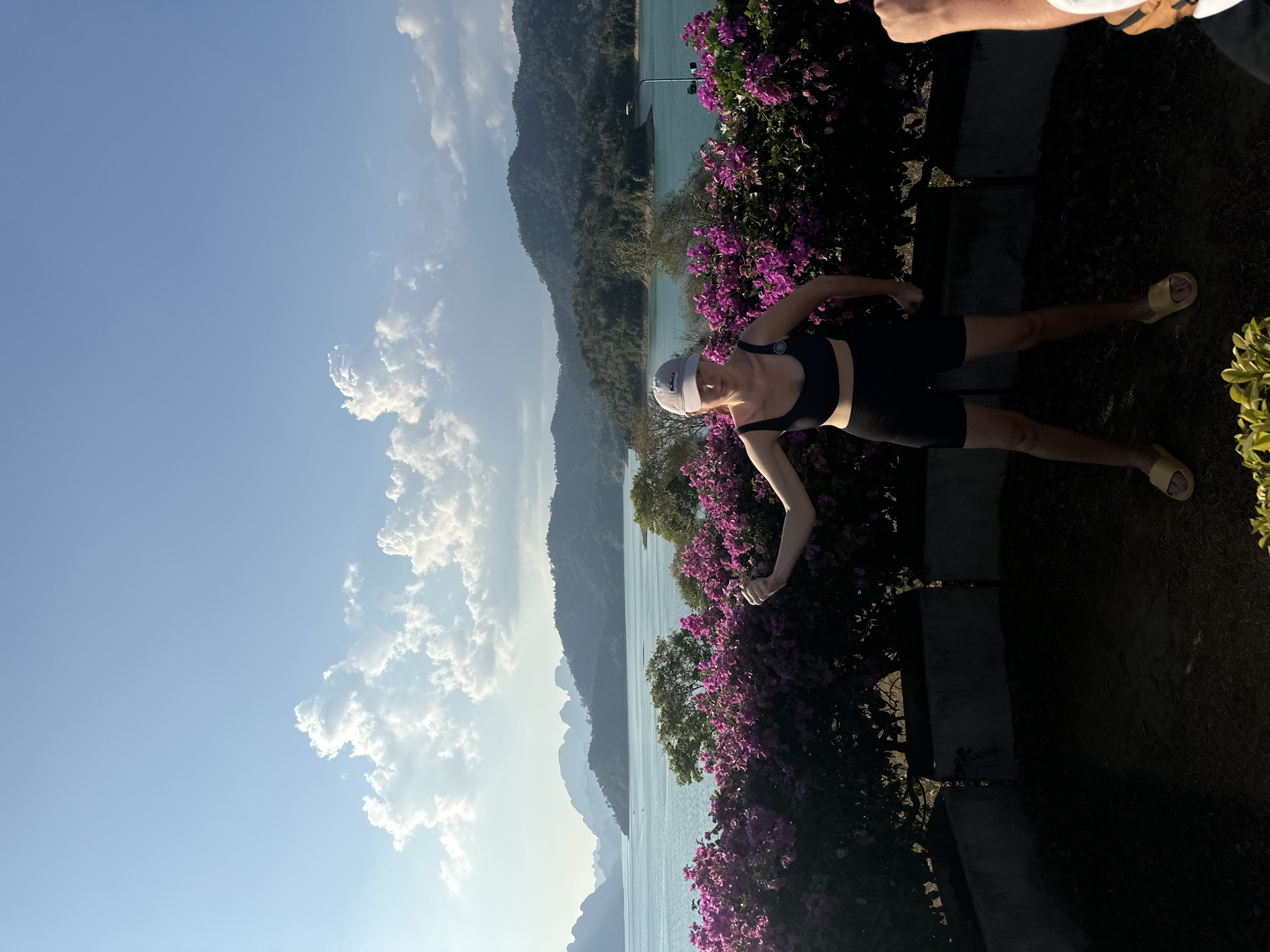 woman in athletic wear standing near a bougainvillea bush with a mountainous, lake-filled background, taken in Khao Phang, Thailand