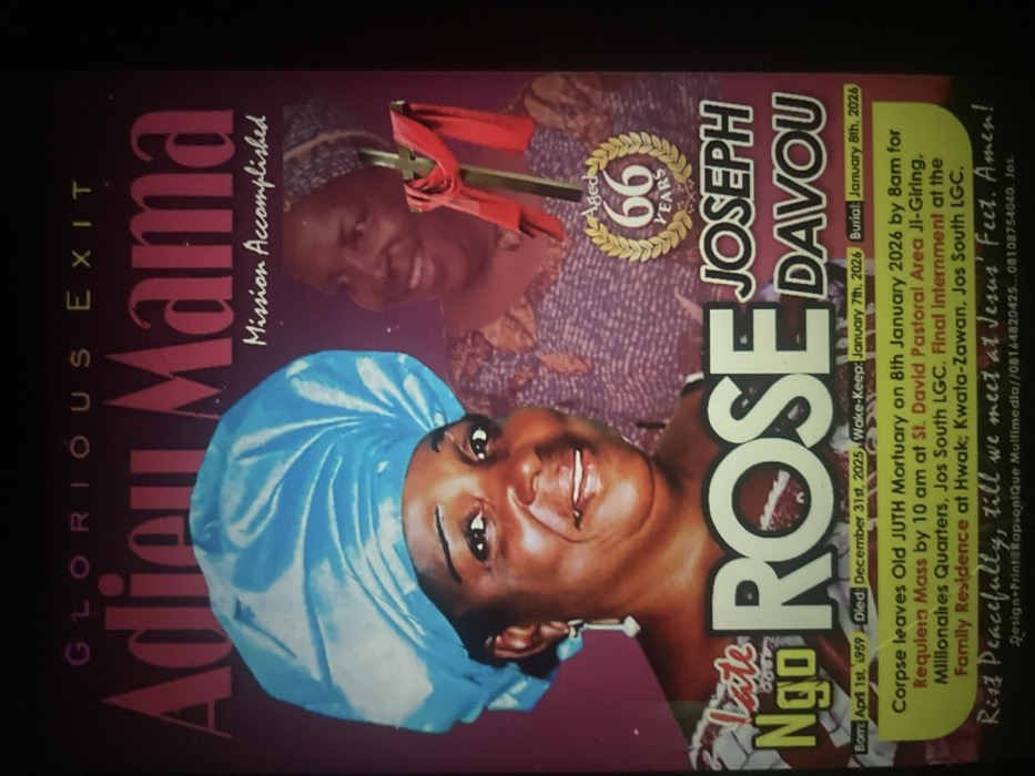 This is a memorial card for Rose Joseph Davou. It displays photos of two women, one older than the other. Text on the card reads "Adieu Mama" and "Mission Accomplished". Rose's birth and death dates are listed as April 1, 1959, and December 31, 2025, respectively. The card also provides details for the wake-keep, burial, mortuary departure, and the Requiem Mass location. The deceased is described as "Aged 66 Years". It ends with the phrase "Rest Peacefully, till we meet at Jesus' Feet. Amen!"