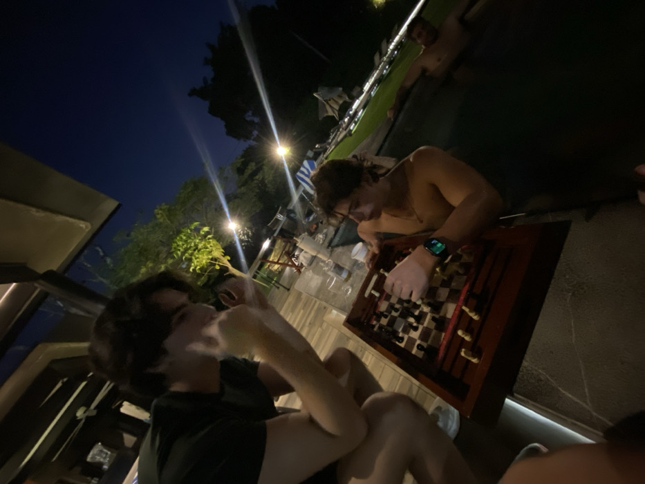 Three shirtless men gather outdoors at night. One man, wearing a smartwatch, is playing a game on a board with pegs and checkers. Another man sits in the foreground, and another is lying down in the background. There is a poolside setting, with a flag and trees visible in the distance. Overhead lights illuminate the scene.