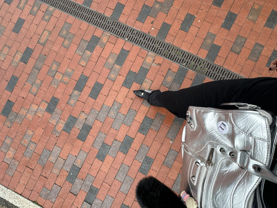 The scene is set in a pedestrian area of Tunbridge Wells, United Kingdom. The ground is paved with rectangular bricks, predominantly reddish-orange, interspersed with dark grey bricks, laid in a running bond pattern. A linear metal drainage grate, containing some visible green vegetation, runs diagonally across the right side of the frame. The lower body of one individual is visible from a high-angle perspective. The person wears black trousers with a white stripe along the outer seam and a black pointed-toe shoe featuring a small yellow triangular detail on the vamp. A metallic silver handbag, detailed with multiple silver-toned zippers, buckles, and studs, is positioned on the left side of the frame. A white circular pin, bearing the black text "Normal Sucks," is affixed to the handbag. Partially visible near the handbag are a black faux fur item and a small, light-colored accessory with pink and blue stripes. The individual's right leg is extended forward, indicating a walking motion or a momentary pause while standing.