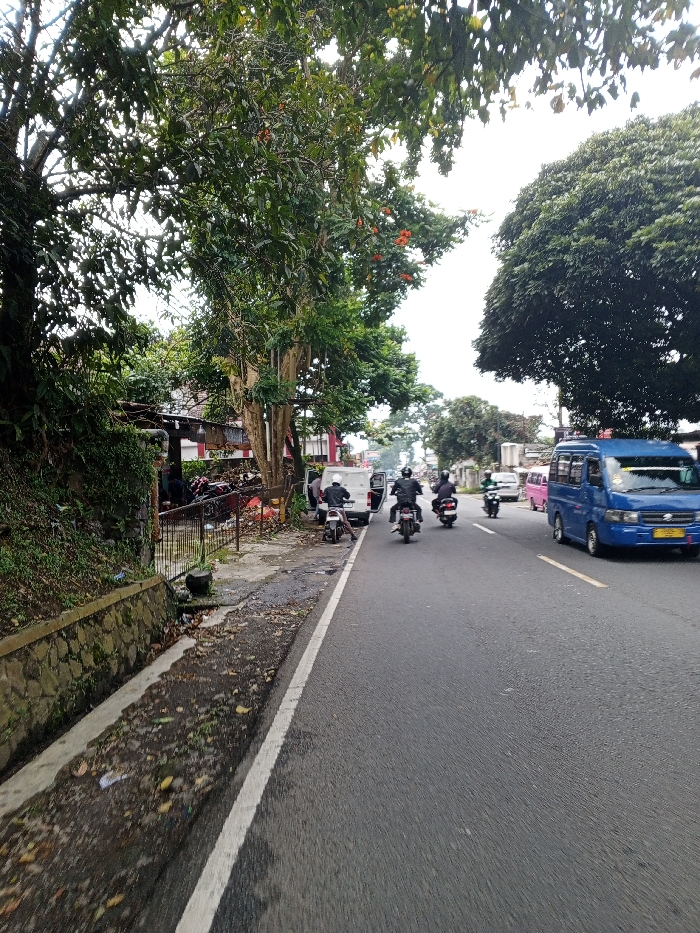 This image depicts a street scene in Multhan, India, captured during daylight. The perspective is from the roadside, looking down a paved asphalt road that extends into the distance. To the immediate left, a concrete drainage ditch containing some debris runs parallel to the road, bordered by a low stone wall topped with green foliage. A narrow, dark, uneven shoulder with scattered debris lies between the ditch and the road, marked by a solid white line. On the left side of the scene, a dense line of trees with green leaves, some exhibiting orange blossoms, partially obscures several buildings, which display red and white architectural elements. A white passenger van is parked on the left shoulder with its side door open, near a black metal railing. An individual in dark clothing is visible near the open van door. Multiple motorcycles are parked or clustered behind the railing. On the asphalt road, three individuals are observed riding motorcycles, all wearing dark jackets and helmets, traveling away from the camera. A blue compact passenger van, featuring a yellow license plate, is also in motion on the right side of the road, proceeding in the same direction as the motorcycles. Further down the road, a pink van and another white van are partially visible. The sky above is bright white, consistent with an overcast condition.