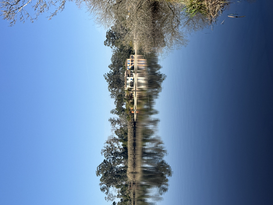 This image depicts a serene waterscape in Mira, Portugal, under a clear, bright blue sky. The lower two-thirds of the frame are occupied by a calm body of water, likely a lake or lagoon, which exhibits a deep blue hue and acts as a reflective surface. The water mirrors the sky and the landscape on the opposite bank with high fidelity. The far bank is characterized by a dense line of vegetation, predominantly tall, slender evergreen trees (possibly eucalyptus), with some sections of bare deciduous trees and tall, dried reeds. On the right side of the far bank, a multi-story building is visible. This structure features light-colored walls (beige/off-white), a red-tiled roof, and multiple windows fitted with closed blue shutters. Several palm trees are positioned immediately in front of and around the building. To the far left on the distant bank, a small wooden pier or dock extends briefly into the water from the vegetated shoreline. The foreground on the immediate right includes a section of bare tree branches and some green riparian vegetation emerging from the water. The sky, occupying the upper third of the image, is uniformly clear and bright blue, devoid of clouds. No human figures, animals, or active objects are present in the scene, which appears bathed in direct daylight.