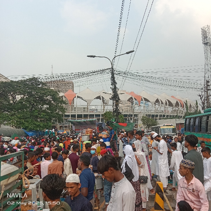 A dense crowd of people fills a street scene, mostly young males. Many wear traditional Muslim caps. In the background, a distinctive stadium with orange and white roof sections stands behind a vendor area marked by Bangladeshi flags. Overhead, a tangle of power lines dominates the sky. A bus sits to the right. The photo is dated "02 May 2025, 15:50."