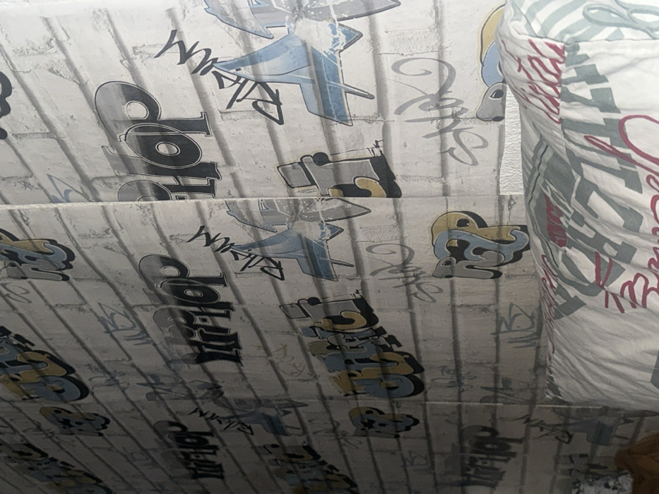 The scene depicts an interior wall, likely within a residence, located in General Toshevo, Bulgaria. The wall is covered in wallpaper featuring a repeating graffiti-style pattern on a simulated white brick background. Key elements of the pattern include the word "HIP-HOP" in stylized dark grey/black bubble letters with lighter grey/blue accents, the term "SK8" or "SKATE" rendered in yellow and blue, and various other illegible tags, scribbles, and graphic elements such as a stylized light blue star or winged character. Illumination is uneven, with the left portion of the wall exhibiting lower light levels than the right. In the lower right foreground, a pillow with a patterned cover in shades of white, grey, blue, and red is partially visible, resting on what appears to be a bed. No persons are present. No actions or interactions are occurring.