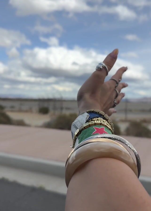 A person wearing several bracelets and rings extends their hand from a moving vehicle toward the sky. The landscape appears to be a desert or arid area. The sky is blue with scattered clouds. The vehicle is moving alongside a road or barrier. The person's hand is outstretched with fingers spread slightly. The bracelets are of various designs and colors. The rings are silver and worn on multiple fingers.