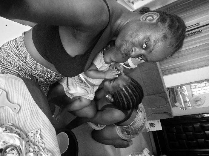 This black and white image depicts an indoor scene within a private residence in Ado, Nigeria, featuring three individuals. In the left foreground, an adult female with dark skin and dark, braided hair, wearing a dark bra-like top and plaid shorts, holds a baby. She looks directly at the camera. The baby, dressed in a light-colored top and shorts, is held facing right, with its hands near its face. To the right, another female, also with dark skin and braided hair, wearing a dark top and denim shorts, kneels on the floor, leaning forward to interact with the baby, appearing to nuzzle its head. The background reveals vertical blinds on the left side of the room. A large, rectangular object, possibly a damaged sofa or a cardboard box, is positioned centrally behind the subjects. To the far right, a dark, paneled door is visible. A mirror, positioned behind the central object, reflects a window with vertical security bars and a standing fan. On the floor in the right foreground, a dark bowl and a smaller, lighter bowl are present, along with a striped fabric and a piece of polka-dotted fabric, next to a small, light-colored object.